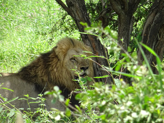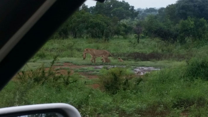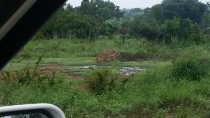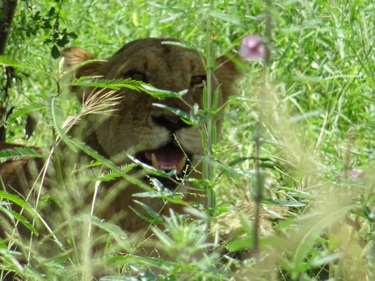 14:00 Kaffeepause im Szukusa Camp -- schnell ein paar Infos von anderen Rangern geholt -- ein Löwe, unweit vom Camp -- also schnell los.